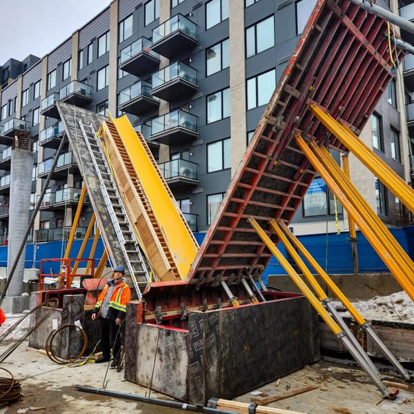 Be sure to adequately shore the form. Use Superchute Bracing Collars, scaffolding, screw-jacks, and similar industry accepted methods to shore and brace the form. Keep away from the erected form.